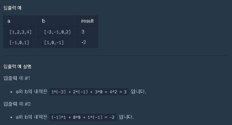 | 길이가 같은 두 1차원 정수 배열 a, b가 매개변수로 주어집니다. a와 b의 내적을 return 하도록 solution 함수를 완성해주세요. 이때, a와 b의 내적은 a[0]*b[0] + a[1]*b[1] + ... + a[n-1]*b[n-1] 입니다. (n은 a, b의 길이) |