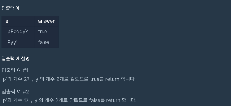 대문자와 소문자가 섞여있는 문자열 s가 주어집니다. s에 'p'의 개수와 'y'의 개수를 비교해 같으면 True, 다르면 False를 return 하는 solution를 완성하세요. 'p', 'y' 모두 하나도 없는 경우는 항상 True를 리턴합니다. 단, 개수를 비교할 때 대문자와 소문자는 구별하지 않습니다. 예를 들어 s가 "pPoooyY"면 true를 return하고 "Pyy"라면 false를 return합니다. |