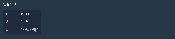 | 길이가 n이고, "수박수박수박수...."와 같은 패턴을 유지하는 문자열을 리턴하는 함수, solution을 완성하세요. 예를들어 n이 4이면 "수박수박"을 리턴하고 3이라면 "수박수"를 리턴하면 됩니다. |