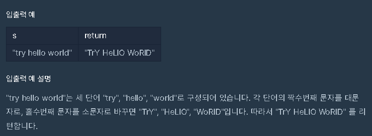 | 문자열 전체의 짝/홀수 인덱스가 아니라, 단어(공백을 기준)별로 짝/홀수 인덱스를 판단해야합니다. 첫 번째 글자는 0번째 인덱스로 보아 짝수번째 알파벳으로 처리해야 합니다. |