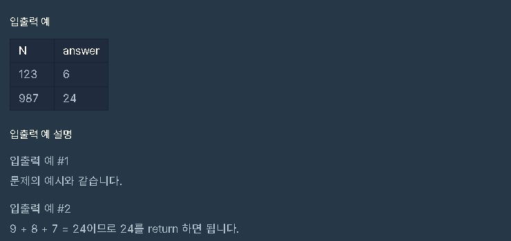 | 자연수 N이 주어지면, N의 각 자릿수의 합을 구해서 return 하는 solution 함수를 만들어 주세요. 예를들어 N = 123이면 1 + 2 + 3 = 6을 return 하면 됩니다. |