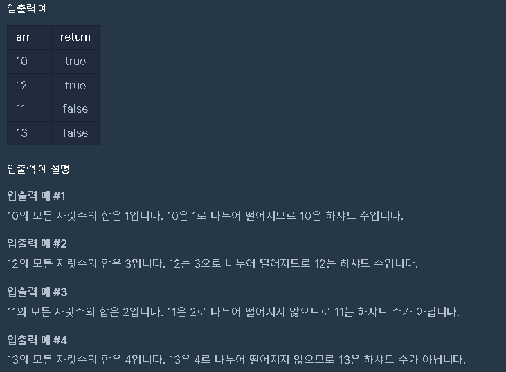 | 양의 정수 x가 하샤드 수이려면 x의 자릿수의 합으로 x가 나누어져야 합니다. 예를 들어 18의 자릿수 합은 1+8=9이고, 18은 9로 나누어 떨어지므로 18은 하샤드 수입니다. 자연수 x를 입력받아 x가 하샤드 수인지 아닌지 검사하는 함수, solution을 완성해주세요. |