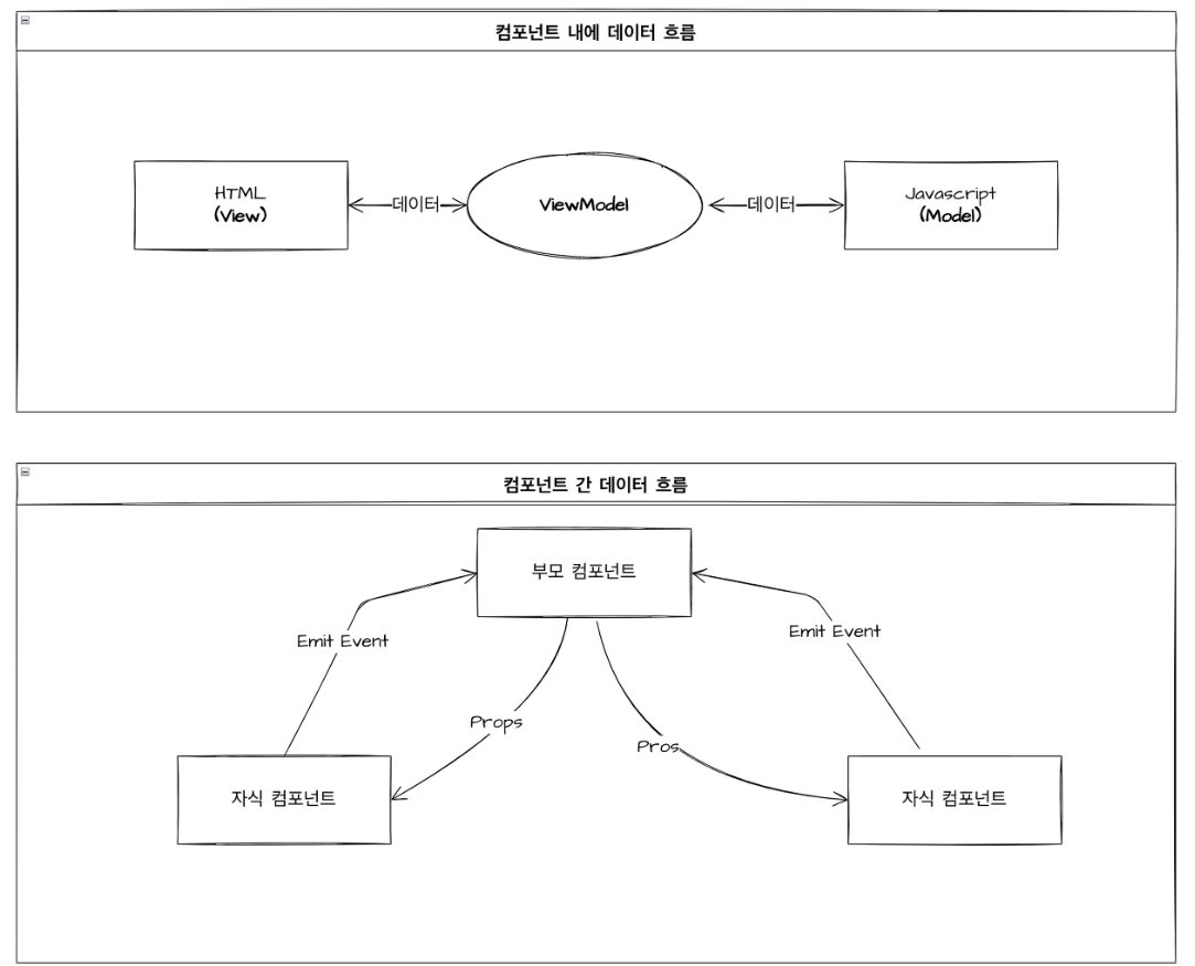 | ⭐ 컴포넌트 내에서 양방향 데이터 바인딩은 JS와 HTML사이 ViewModel이 존재하여 하나로 binding되어 둘 중 하나라도 변경되면 함께 변경되는 것을 의미한다. |