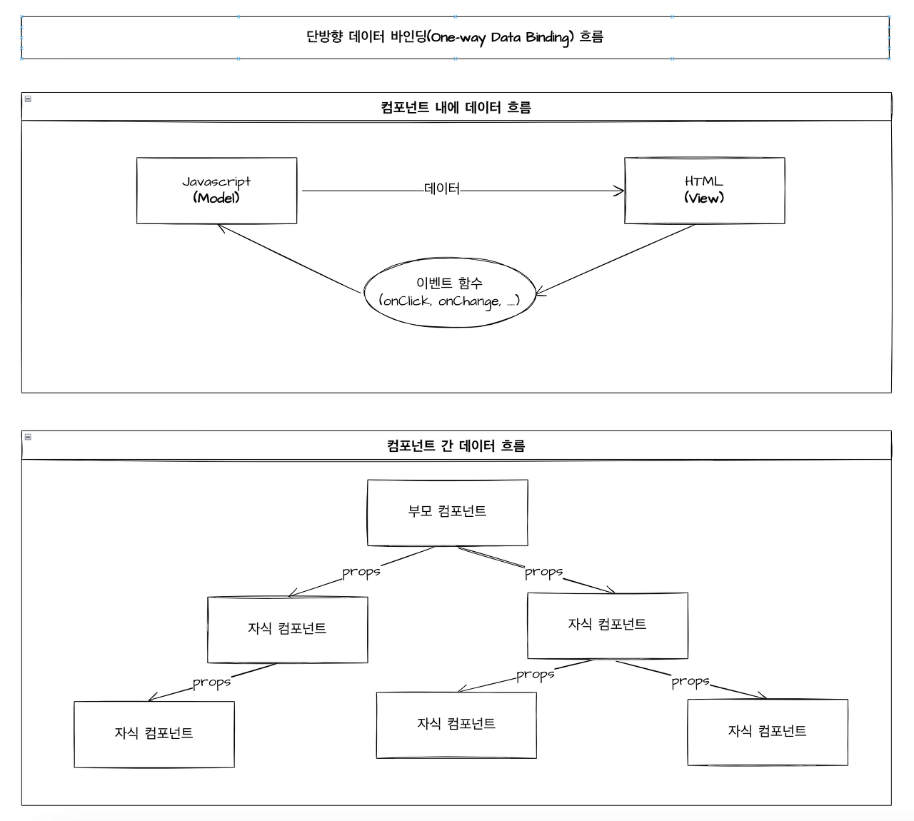 | ⭐컴포넌트 내에서 단방향 데이터 바인딩은 JS(model)에서 HTML(view)로 한 방향으로만 데이터를 동기화하는 것을 의미한다.[JS(model) -> HTML(view)] |