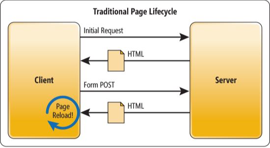 | 모든 정적 리소스를 최초 한번에 다운로드 --> 새로운 페이지 요청이 있을 때 필요 데이터만 받아 갱신 |