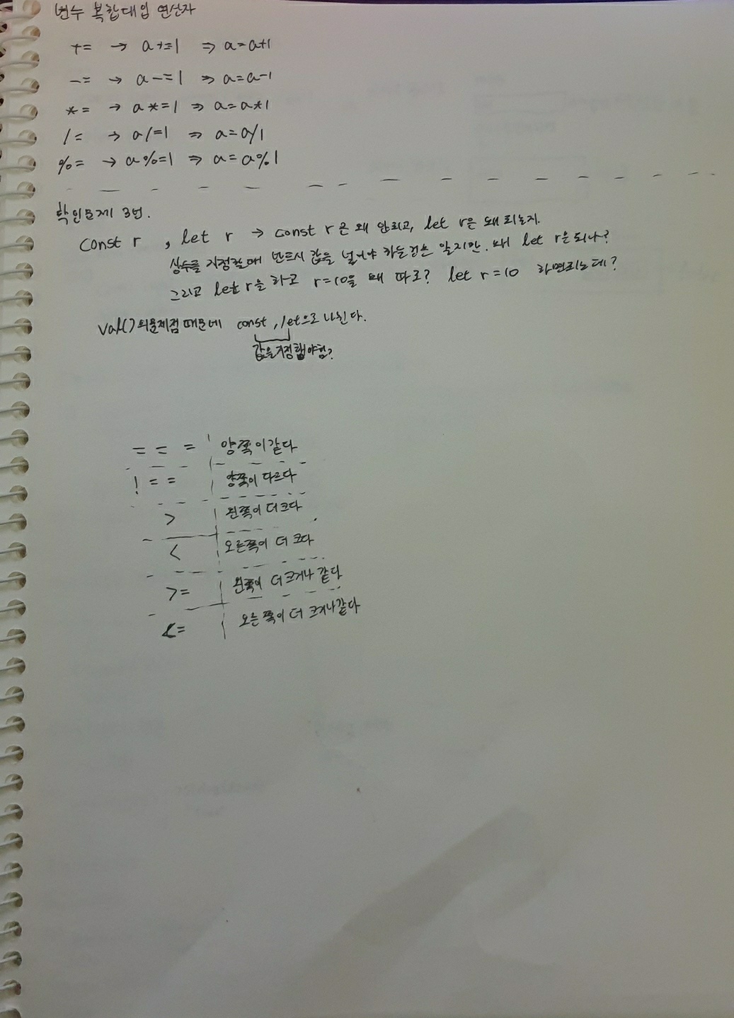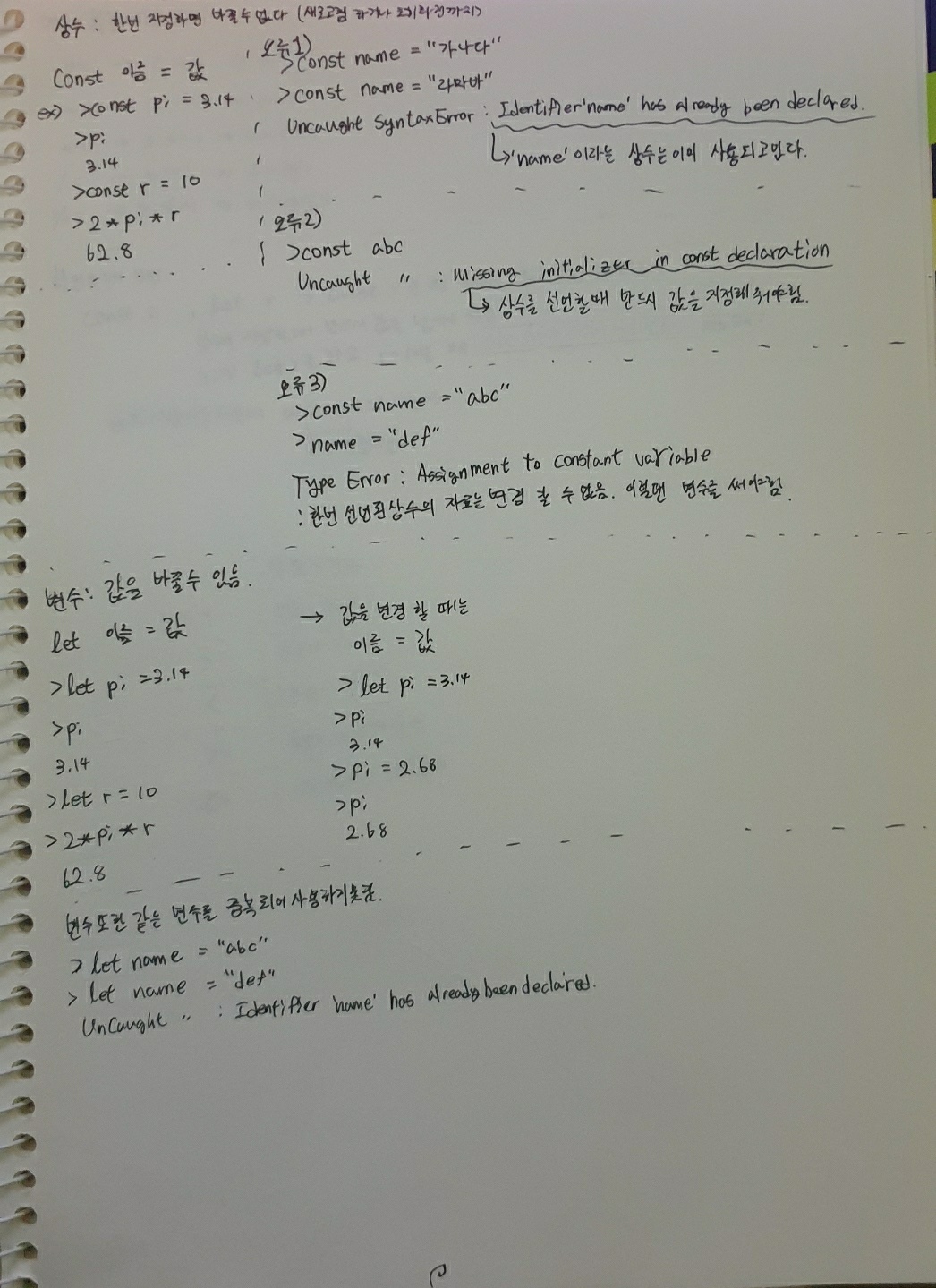 상수 : 페이지를 새로고침 하기 전 까지 값을 바꿀 수 없다. / 변수를 지정하는 자리에서 무조건 값까지 선언해야한다.