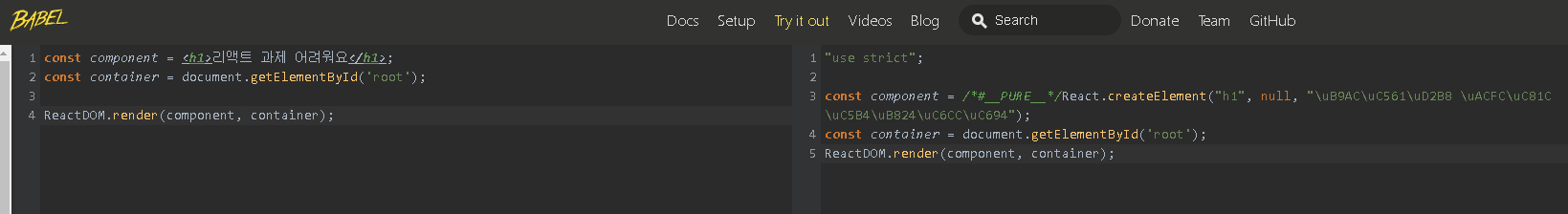 바벨 REPL도구를 사용하면 어떤 식으로 코드를 변환하는지 알 수 있습니다.