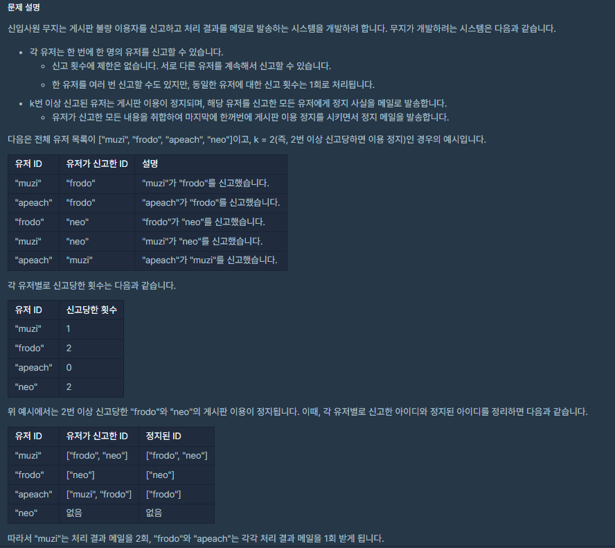 프로그래머스 - 신고 결과 받기id순서배열과 신고내역 배열, 정지기준이 인자로 들어오고, 피신고인의 피신고량이 정지기준을 넘기면 신고자에게 신고결과메일을 발송한다.이때 모든 id_list에 대한 신고결과메일 발송량을 리턴하면 된다. function solution(id_list, report, k) { var answer = []; //누가 누구들을 신고했는지에 대한 배열 let reportArr = {} //누가 누구들에게 의해서 신고당했는지에 대한 배열 let reportedArr = {} //각 id마다 신고, 피신고 배열을 만들어 객체에 넣어줌 id_list.forEach((id) => { reportArr[id] = [] report..